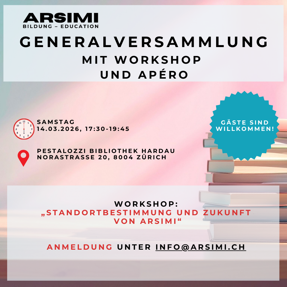 Zu unserer Jahresversammlung am 14. März mit anschliessendem Workshop laden wir Sie ganz herzlich in die Interkulturelle Pestalozzi Bibliothek Hardau (Schulhaus Albisrieden) in Zürich ein.