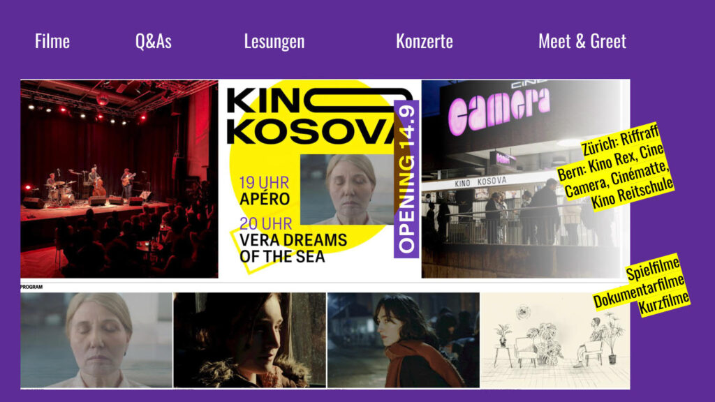 Kino Kosova organisiert zwei mal im Jahr ein Filmfestival in Bern und Zürich. Das fünftägige Festival erzählt Geschichten von den Herausforderungen und Hoffnungen unterschiedlichster Menschen und ist ein Ort des Austausches. Zahlreiche Begegnungs-möglichkeiten mit Filmemachenden, Autor:innen und Musiker:innen und die moderierten Q & A’s nach den Filmen geben tiefe Einblicke in deren kulturelles Schaffen.